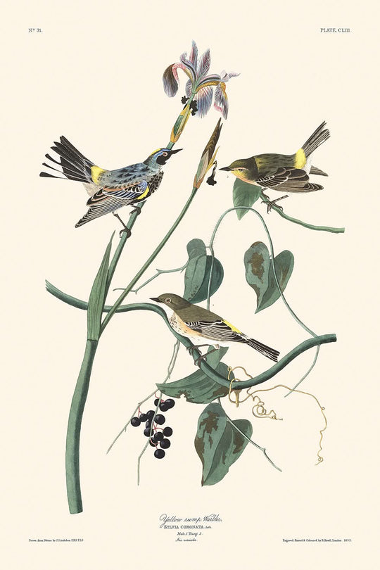 Der in diesem Kunstwerk dargestellte „Gelbkronen-Waldsänger“ oder Sylvia coronata zeichnet sich durch seine lebhafte Beobachtung der Migration und des Sozialverhaltens des Vogels aus. Audubons Illustration zeigt den Vogel im vollen Sommergefieder, wobei seine leuchtenden Gelb- und Grautöne hervorgehoben werden und er einen einzigartigen Einblick in seinen Lebenszyklus und seine Gewohnheiten bietet. Sammler und Naturliebhaber werden die Liebe zum Detail gleichermaßen zu schätzen wissen, von der zarten Form des Vogels bis hin zu seiner malerischen Umgebung.