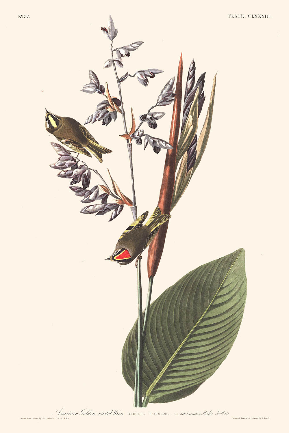 El Wren de Cresta Dorada Americano (Placa 183) de John James Audubon, publicado por primera vez en 1827, es una ilustración cautivadora de una de las obras ornitológicas más significativas, Las Aves de América de Audubon. Esta encantadora representación muestra la vitalidad y la belleza detallada del Wren de Cresta Dorada Americano en su hábitat natural.