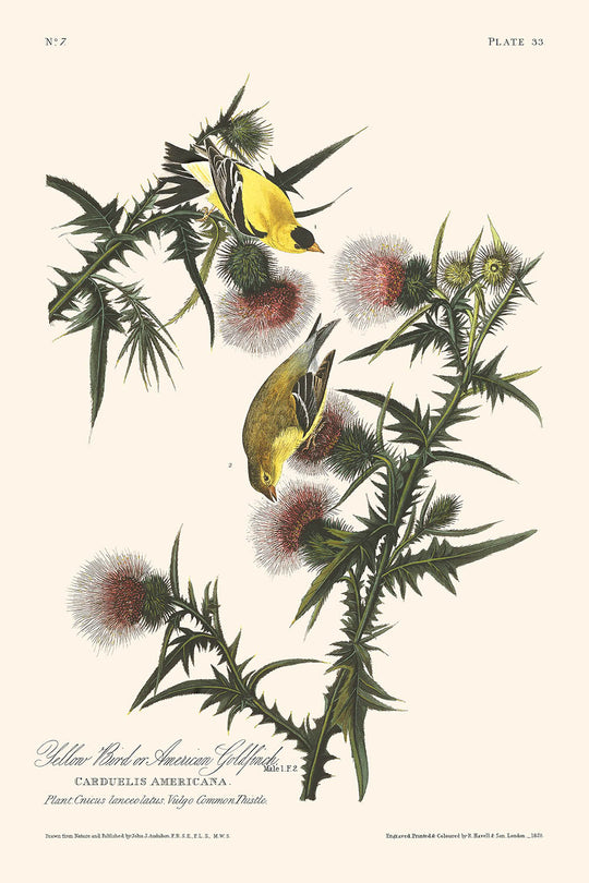El Jilguero Americano (Placa 33), publicado por primera vez en 1827, es una ilustración detallada y cautivadora de la renombrada obra de John James Audubon, Los Pájaros de América. Esta ilustración captura la esencia vibrante y animada del Jilguero Americano, un pájaro conocido por su llamativo plumaje amarillo y su encantador comportamiento.