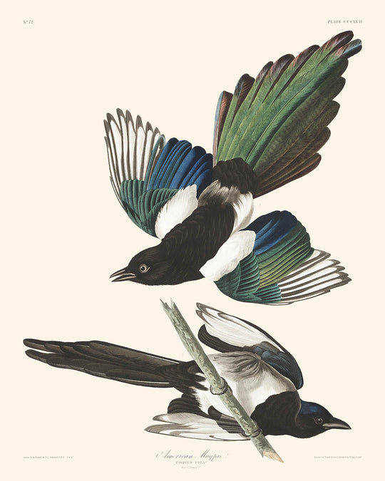 Los vívidos contrastes de tonos negros, azules y verdes en las plumas de la Urraca, tal como lo representa Audubon, aportan un elemento dinámico y vibrante a cualquier espacio. Los observadores apreciarán la meticulosa representación de texturas y patrones, mostrando la habilidad de Audubon para combinar precisión científica con maestría artística. Al poseer esta impresión, capturas un pedazo de la historia natural representada a través de los ojos de uno de los más grandes artistas de América.
