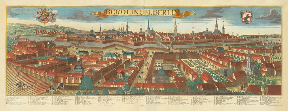 Mapa antiguo de Berlín, 1760 por Balthasar Probst: Carta panorámica antigua con escudo de armas