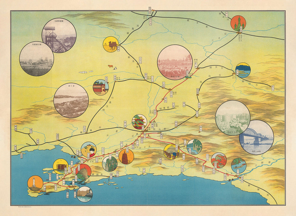 Ocupación japonesa de la costa china de Manchuria, 1938: Antiguo mapa pictórico del noreste de China