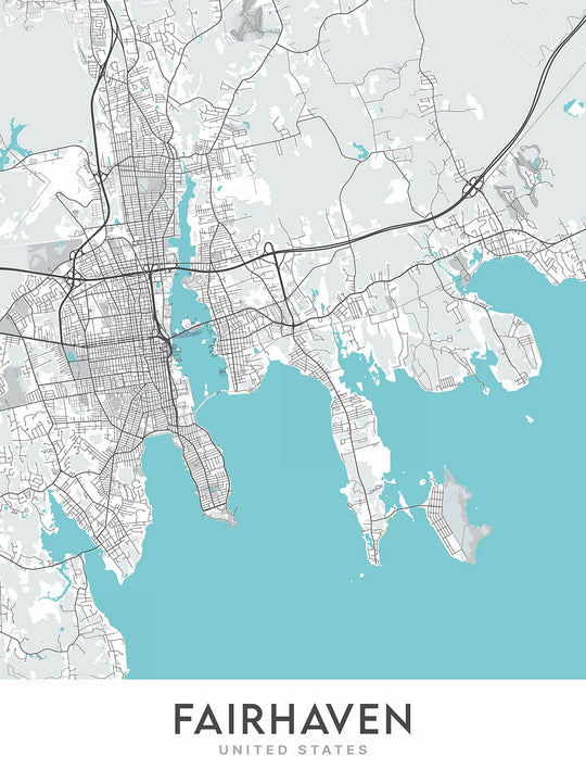 Este mapa de Fairhaven es un callejero moderno y detallado centrado en la estética y el diseño de interiores. Es una obra de arte, no una herramienta de navegación. El mapa cubre un área grande, incluido el centro de la ciudad, los pueblos circundantes y las carreteras principales. Presenta una cartografía única, un diseño moderno y una paleta de colores única, lo que lo convierte en una adición atractiva para cualquier hogar u oficina.
