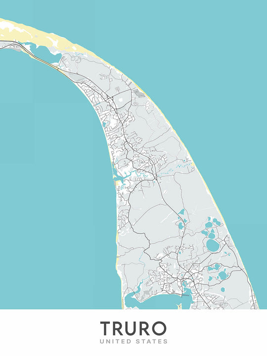 El mapa también incluye varios puntos de referencia y puntos de interés, como Truro Vineyards, Highland Light, Corn Hill Beach, Pilgrim Spring y Pond Village Store. Estos puntos de referencia proporcionan contexto adicional y hacen que el mapa sea aún más informativo y atractivo. Si usted es un residente local, un turista o simplemente alguien interesado en los mapas y la geografía, este mapa de Truro es una adición imprescindible a su colección.
