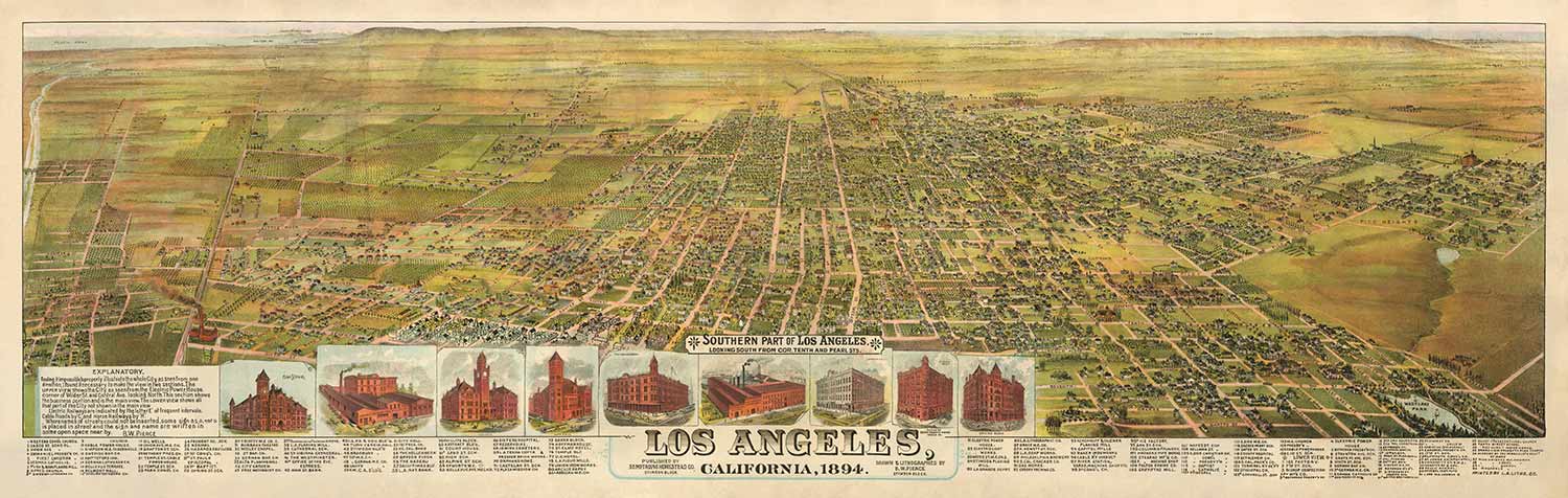 El mapa muestra la parte sur de Los Ángeles desde un punto de vista sobre la esquina de las calles 10 y Pearl (hoy llamada Figueroa Street). Para que puedas orientarte, la esquina inferior izquierda del mapa muestra West Lake Park y Pico, el centro de Downtown LA está en el centro, y el mapa mira hacia el sur hacia Redondo y el Océano Pacífico a lo lejos.