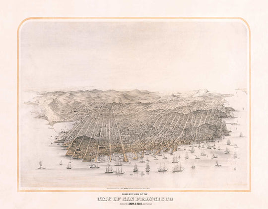 Este mapa ocular sorprendentemente hermoso e interesante muestra la ciudad "Boomtown" de San Francisco en 1868 después de que se había sometido a una expansión masiva después de la prisa del oro a principios de la década de 1800. El mapa fue creado y publicado por Snow & Roos. Este mapa es extremadamente raro: posiblemente solo hay 1 o 2 copias del mapa original en existencia.
