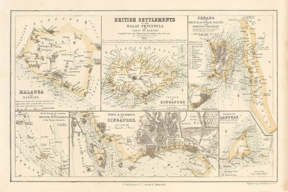 El mapa muestra vistas detalladas de la Isla de Singapur, una vista cercana de la ciudad y el puerto de Singapur, Penang (entonces conocido como Isla del Príncipe de Gales), Labuan frente a la costa de Borneo, y Malaca y Naning. También hay un mapa ampliado que muestra las posiciones relativas de estos asentamientos.
