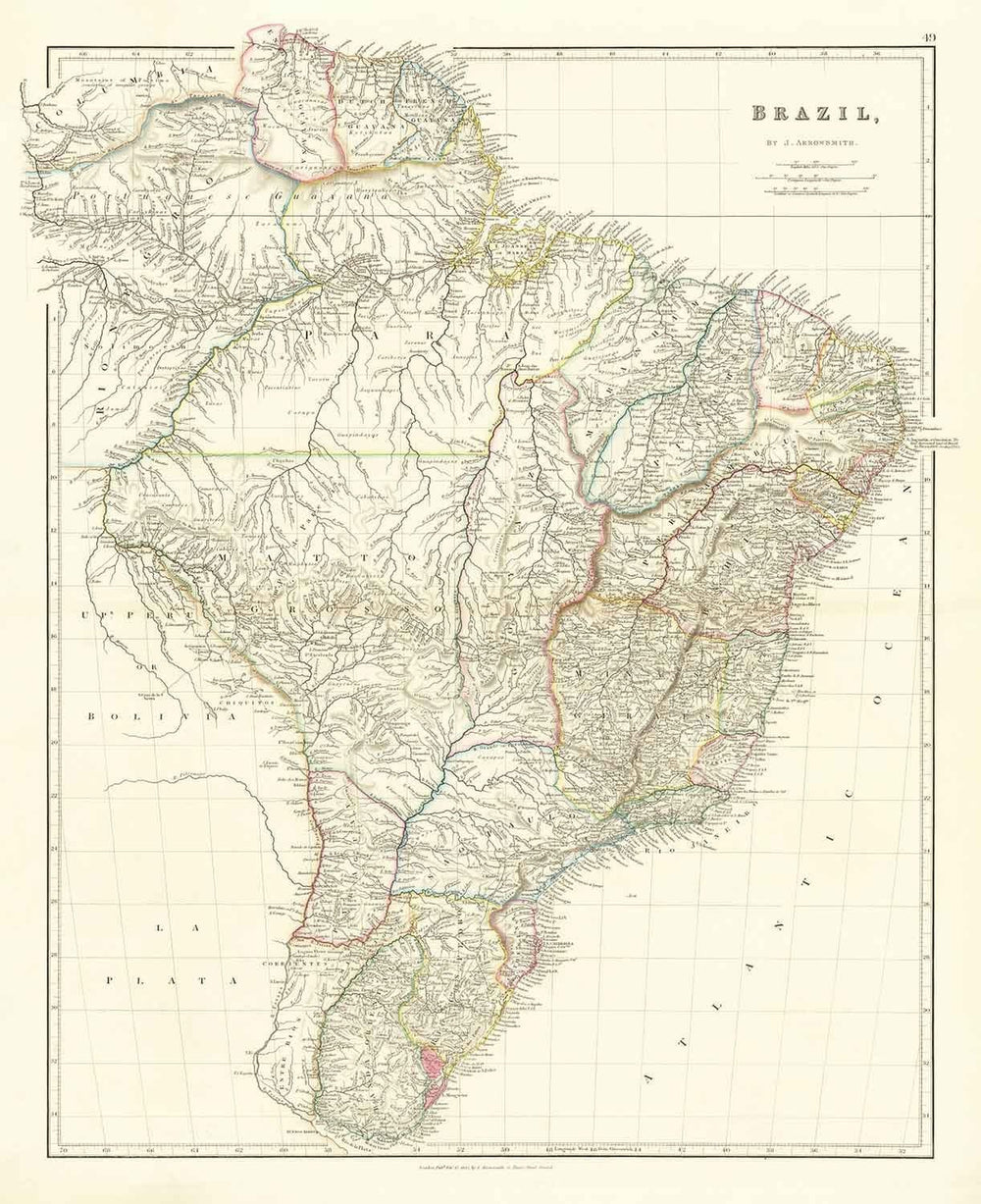 Una magnífica mapa de Brasil, publicado originalmente en 1832, que fue un período muy interesante para este país. Unos años antes, el Rey de Portugal había huido de Europa para escapar de Napoleón, lo que llevó a que Brasil se incorporara al reino unido de Brasil y Portugal.