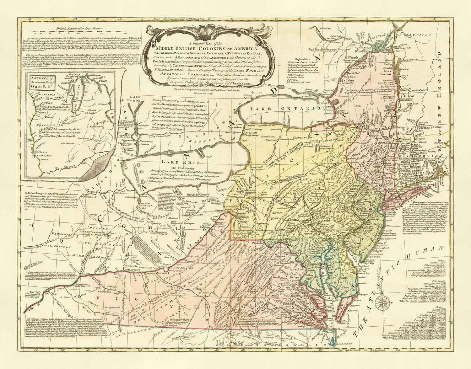 Publicado en 1755 por Lewis Evans y John Bowles, este es quizás el mapa más fino y raro de las colonias británicas (y europeas) en América del Norte.