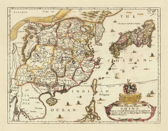 Un mapa precioso y muy antiguo de China, publicado originalmente por el maestro cartógrafo británico Richard Blome en 1669. Aunque el mapa puede parecer bastante rudimentario a tus ojos, esta fue una de las primeras vistas precisas de China publicadas en Europa.