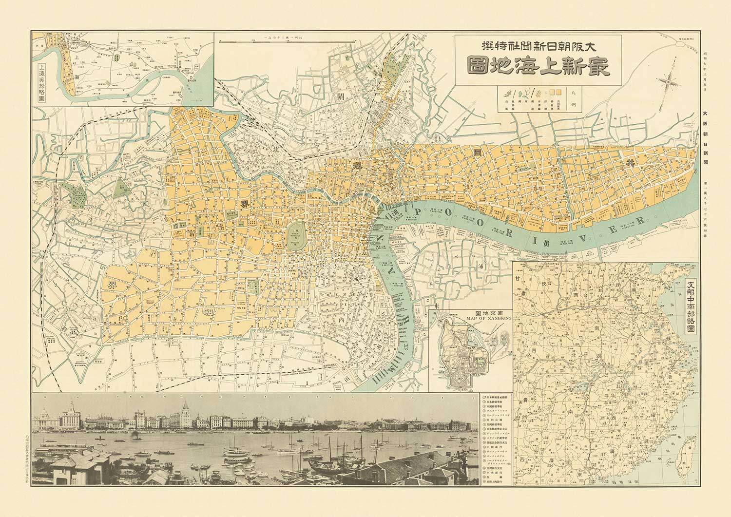 Mapa antiguo de Shanghai en 1935 por Osaka Daily News: Río Huangpu, distrito de Yangpu, Pudong, Lujiazui, Jing'an