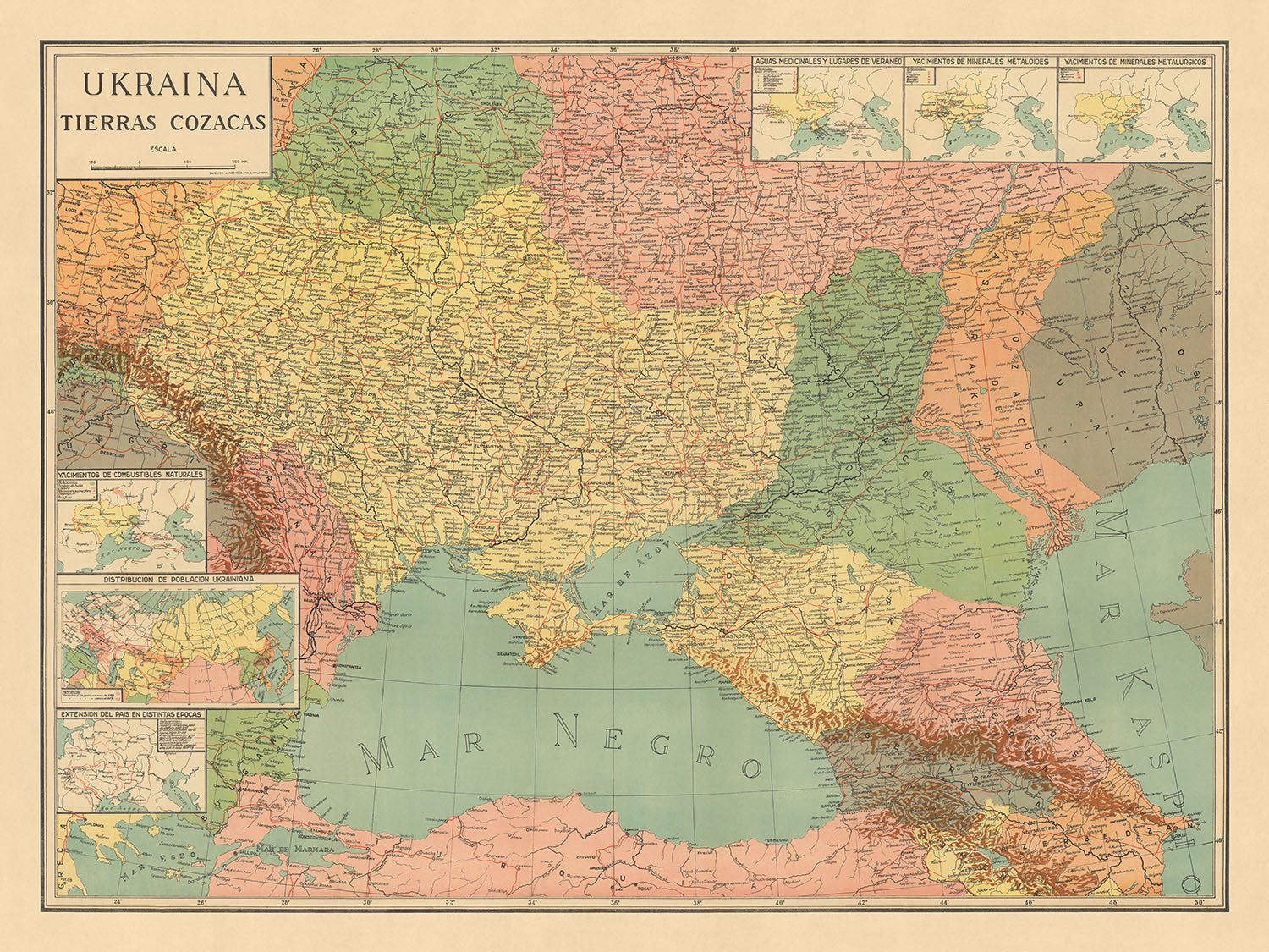 Las características naturales están elegantemente retratadas, con el Mar Negro y el Mar de Azov proporcionando un impresionante telón de fondo para las regiones del sur. La sombra de relieve resalta los terrenos montañosos de los Cárpatos y el Cáucaso, añadiendo profundidad y dimensión al mapa. Estas características geográficas no solo definen el paisaje físico, sino que también juegan un papel crucial en las narrativas históricas de la región. La atención del mapa a los recursos naturales, como los depósitos de combustible y minerales, subraya la importancia económica de estas áreas.