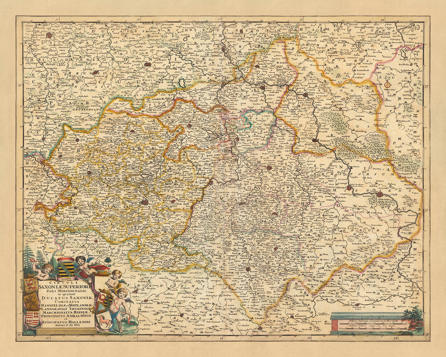 El mapa es rico en detalles e incluye las ciudades de Leipzig, Dresde, Magdeburgo, Halle (Saale) y Erfurt. Leipzig, una ciudad de importancia histórica, fue un importante centro europeo de aprendizaje y cultura en campos como la música y las publicaciones. También se destaca Dresde, conocida como el Joyero por su centro urbano barroco y rococó, que permite vislumbrar su pasado antes de convertirse en la capital de Sajonia.
