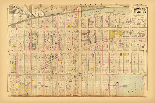 Mapa antiguo del Upper West Side, Nueva York, 1879: Central Park, Riverside Park, Broadway, Ward 22