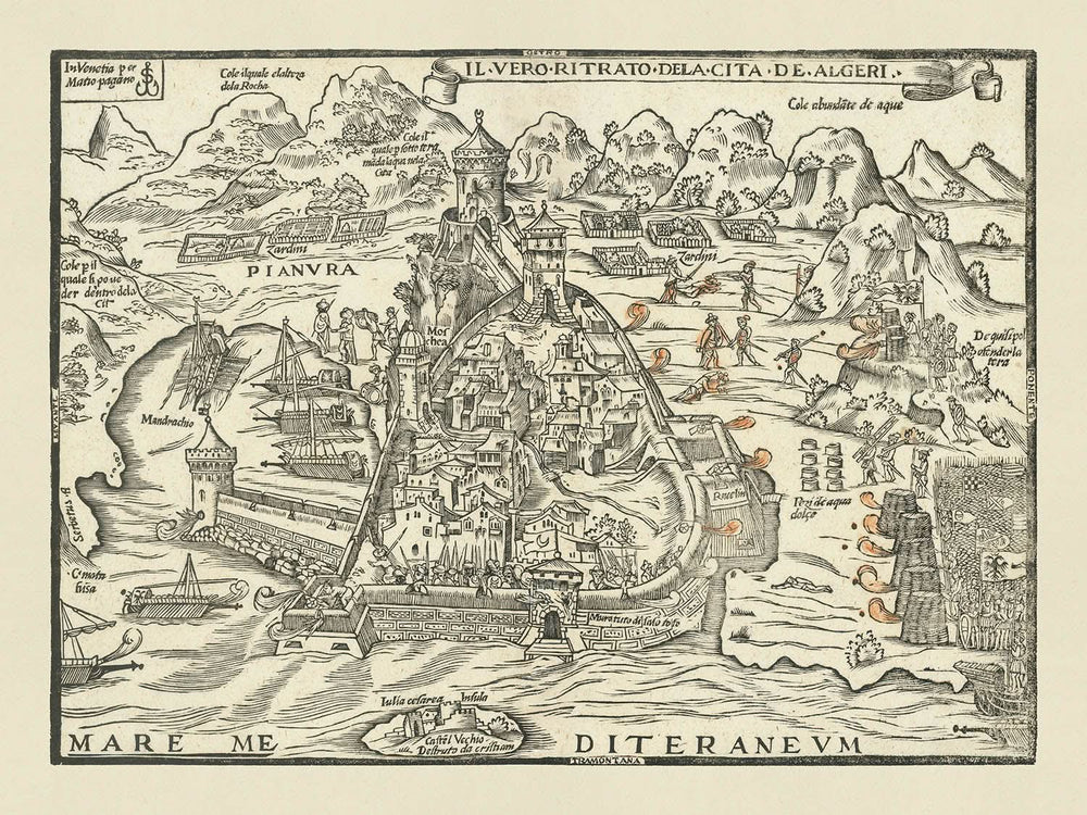 Antigua Mapa Militar del Asedio de Argel de 1541 por Pagano: Argel, Mandrachio, Castel Vechio, Estrategia Naval, Imperio Otomano