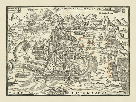La importancia histórica del mapa es inigualable, ya que proporciona una ventana a las estrategias militares y los desafíos enfrentados durante el asedio. La representación de Argel, con sus muros fortificados y campamentos militares estratégicos, ilustra los intensos preparativos y maniobras emprendidas por las fuerzas de Carlos V. La presencia de barcos en el puerto destaca el aspecto naval de la campaña, mientras que el terreno circundante y las características naturales añaden profundidad a la narrativa de este evento histórico. Este mapa no es solo una representación geográfica, sino una obra maestra narrativa que captura el drama y la complejidad de la guerra del siglo XVI.