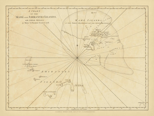 Este mapa de 1776 de las islas Mahé y Amirantes, publicado por Robert Sayer, es una carta marítima temprana rara e importante de las Seychelles. El mapa cubre las islas Mahé y Amirantes, también conocidas como los Tres Hermanos y los Siete Hermanos, junto con sus bajíos, en una época en la que la región era una colonia francesa. La carta incluye extensos sondeos, notas sobre el fondo del mar, comentarios sobre arrecifes, líneas de rumbo, bancos de arena, nombres de lugares y una gran cantidad de otra información práctica para el navegante.