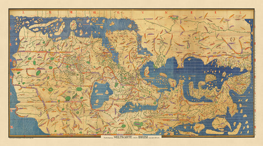 Emprende un viaje a través del tiempo con la ilustre Charta Rogeriana, un mapa del mundo meticulosamente elaborado por el renombrado geógrafo árabe, Muhammad Al-Idrisi, en el año 1154. Esta obra maestra, también conocida como la Tabula Rogeriana, fue encargada por el rey normando Roger II de Sicilia, encapsulando un mundo que va más allá de los límites del Mediterráneo. La obra innovadora de Al-Idrisi, basada en extensas entrevistas con viajeros experimentados y la síntesis de conocimientos fiables, representa una confluencia de geografía, clima y exploración, artísticamente representada a través de continentes desde Europa hasta Asia, y de África al Océano Índico. Este mapa temático, con su única orientación de sur en la parte superior, se extiende desde las costas de España hasta la vasta extensión de Corea, trazando tierras tanto conocidas como misteriosas para la mente medieval.