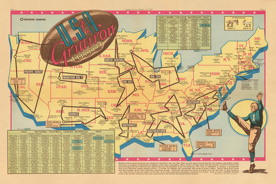 Historically, "U.S.A. Gridiron" stands as a unique artifact of American culture, blending the excitement of sport with the artistry of cartography. Published during the uncertainty of World War II, it reflects the nation’s longing for continuity, entertainment, and pride. Sundberg’s creation is both a celebration of football’s golden age and a poignant reminder of the power of sport to unite communities across vast distances. For collectors and connoisseurs of Americana, this map is an evocative snapshot of a nation in motion—both on the field and across the landscape.