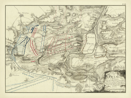 Presentamos "La Batalla de Praga" (1778) de un artista anónimo, que muestra un momento crucial en la historia militar europea a través de un grabado en cobre bellamente intrincado. Esta obra de arte, titulada originalmente "Schlacht bey Praag, in Böhmen, welche den 6. May 1757. von dem Koenig von Preussen, wieder der Kayserlichen Armee, unter Anführung des Prinzen Carls von Lothringen, gewonnen worden," ofrece un relato visual detallado de la Batalla de Štěrbohol, un evento crítico durante la Guerra de los Siete Años.