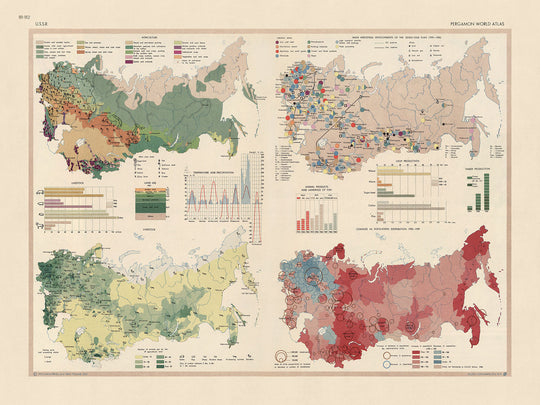 El valor de este mapa radica no solo en su representación geográfica de la URSS, sino también en la riqueza de información que proporciona a través de sus infografías. Cuatro mapas y seis gráficos pintan colectivamente un cuadro vívido de varios aspectos de la URSS, incluyendo población, desarrollo industrial, ganado, uso de la tierra, clima y agricultura. Cada infografía es un testimonio de la meticulosa atención al detalle del cartógrafo y su compromiso de proporcionar una visión integral del complejo tejido socioeconómico de la URSS.