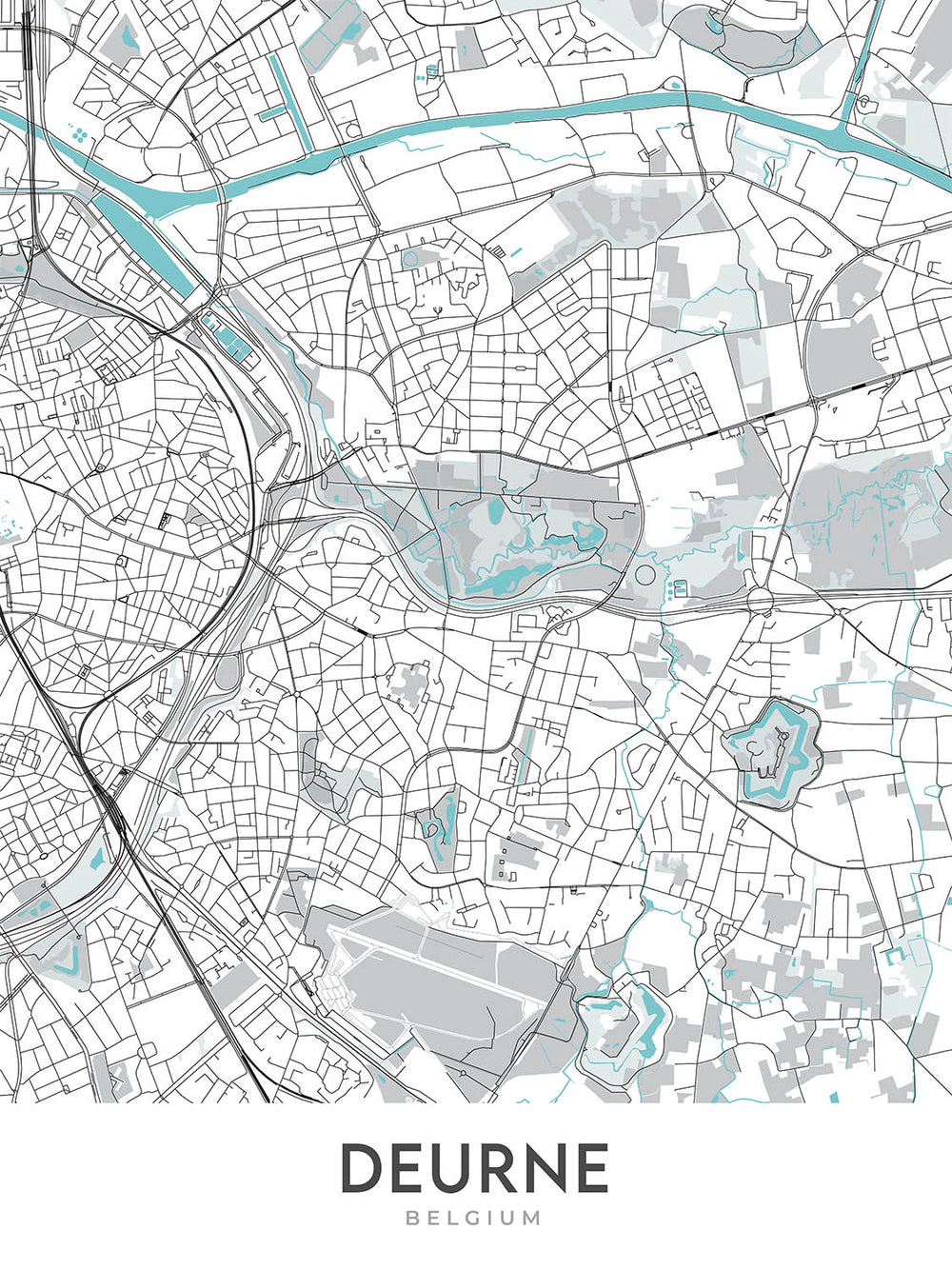 Mapa moderno de la ciudad de Deurne, Bélgica: Ayuntamiento, parque Rivierenhof, complejo deportivo Luchtbal, A12, N13