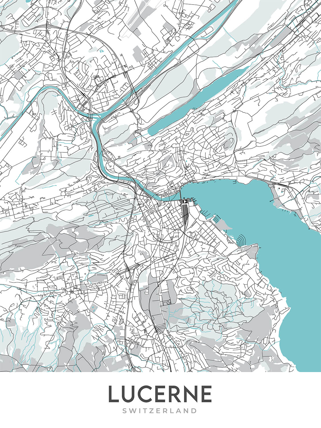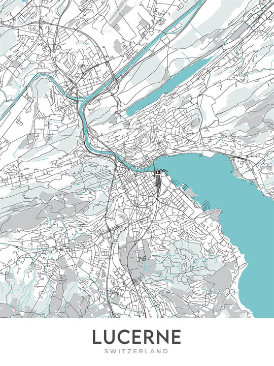 El mapa muestra el paisaje urbano de Lucerna, capturando la esencia y el espíritu de la ciudad. Los intrincados detalles y las líneas limpias la convierten en una pieza visualmente impactante. La paleta de colores apagados añade un toque de sofisticación y elegancia, lo que la hace adecuada para varios estilos de diseño de interiores.