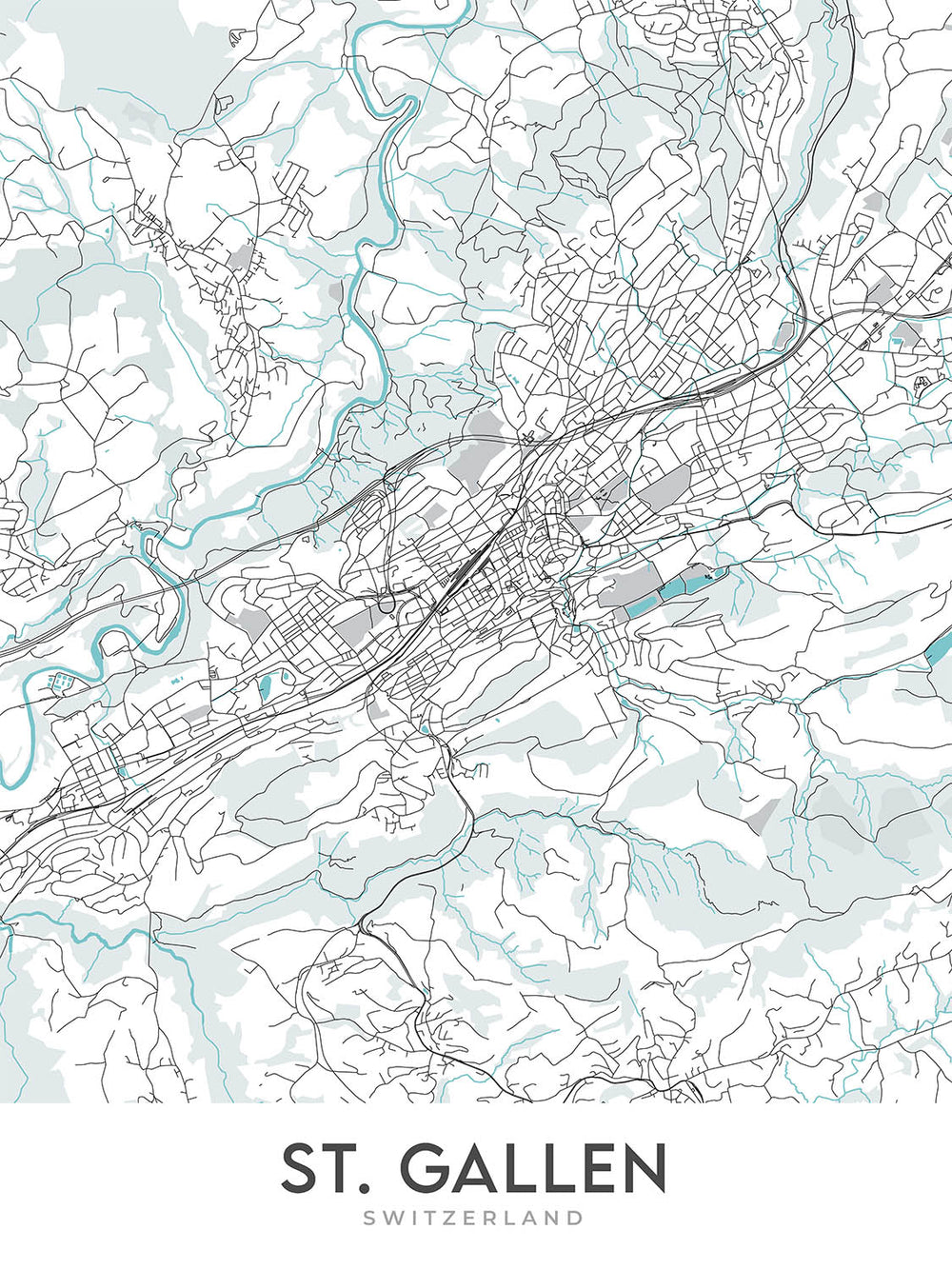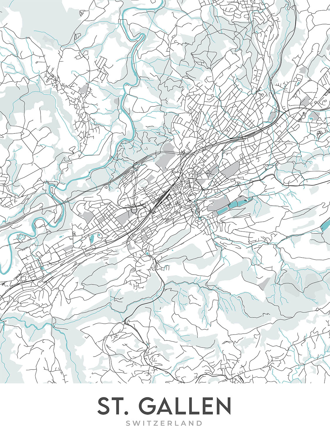 El mapa se centra en la ciudad de St. Gallen y sus alrededores, proporcionando una visión detallada de las calles, puntos de referencia y barrios de esta hermosa ciudad. El mapa es perfecto para quienes están interesados en explorar la ciudad o para quienes simplemente desean agregar un toque de diseño moderno a su hogar u oficina.