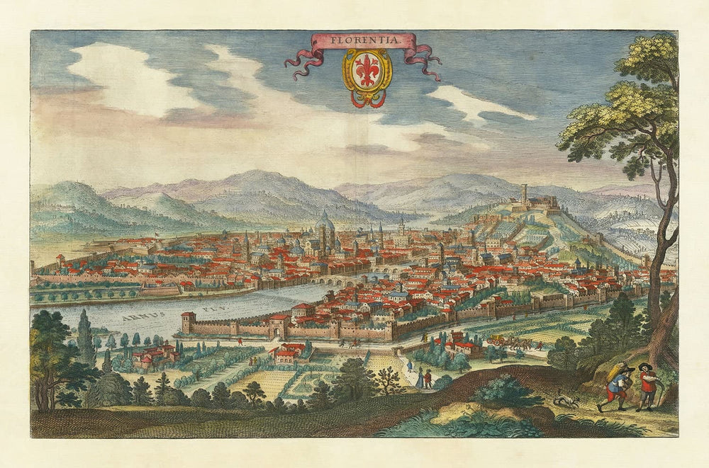 Muchos de los edificios emblemáticos de Florencia son claramente visibles incluso en 1640, incluyendo el Duomo de la Catedral de Santa María del Fiore, la galería Uffizi junto al río, y varias fortificaciones y murallas de la ciudad. El río Arno y el Ponte Vecchio, por supuesto, se pueden ver en el medio del mapa.