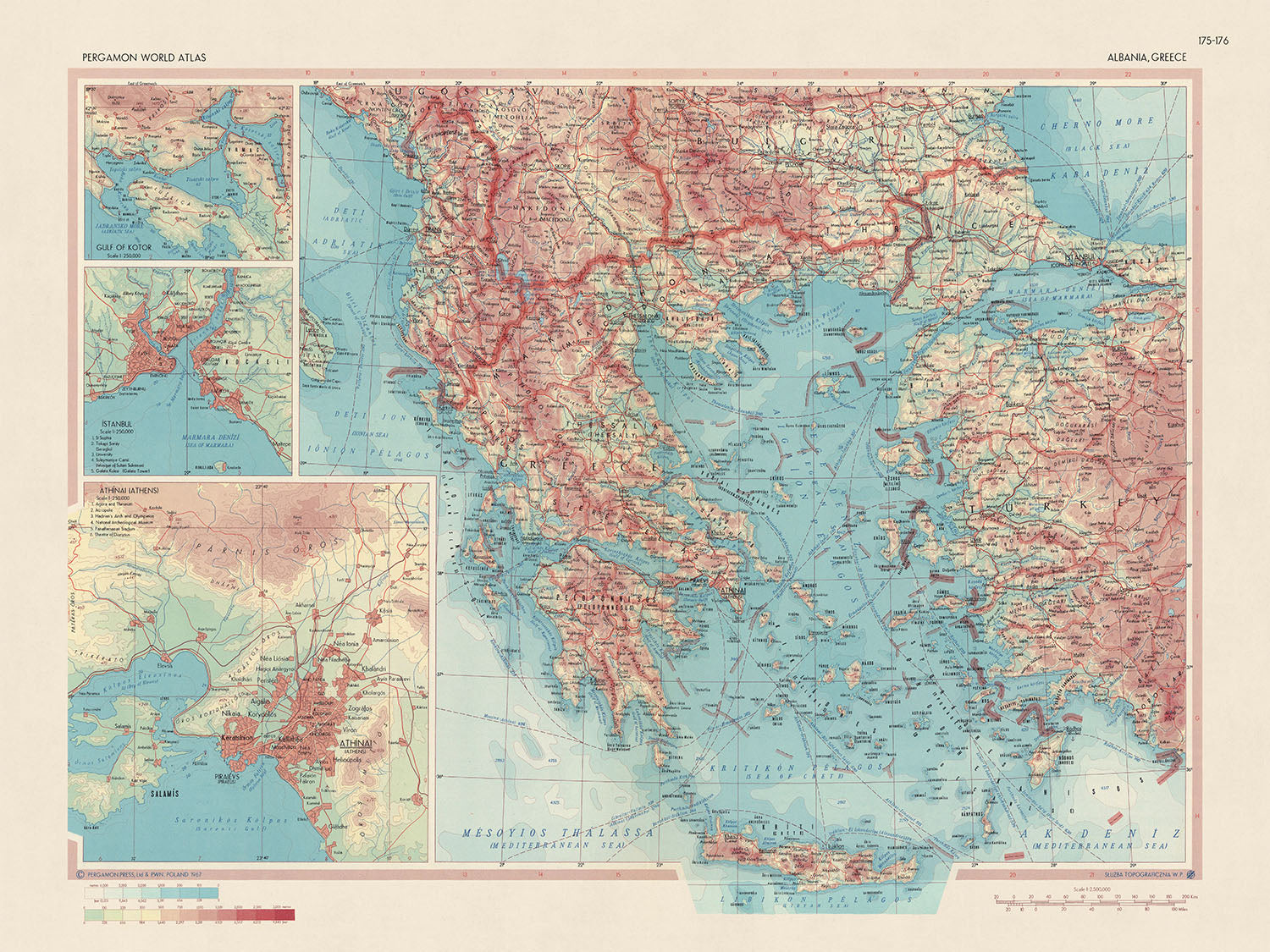 El mapa no es sólo una guía política sino también física, y ofrece una descripción detallada de la topografía de la región. Ilustra maravillosamente los variados terrenos de Albania y Grecia, desde los escarpados Alpes albaneses hasta las idílicas islas griegas. También proporciona una vista detallada de ciudades importantes como Athinai (Atenas), Estambul y el Golfo de Kotor. Estos insertos añaden profundidad al mapa, proporcionando una comprensión más íntima del contexto geográfico de estas ciudades dentro del paisaje regional más amplio.