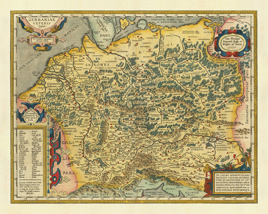 Este es un mapa detallado de la antigua Alemania y el norte de Europa de 1624 realizado por Abraham Ortelius, uno de los cartógrafos más famosos de todos los tiempos. El mapa muestra la región tal como se conocía en la época romana, con los nombres de las antiguas tribus y asentamientos germánicos etiquetados en todas partes. El mapa también incluye los principales ríos y montañas de la región, así como el Mar Báltico, el Mar del Norte y el Océano Atlántico.