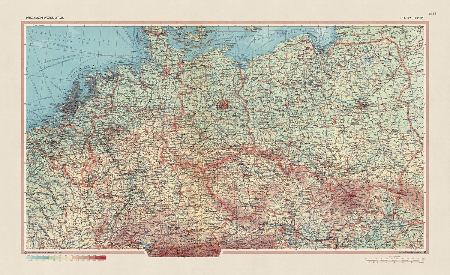 El mapa titulado 'Europa Central', publicado en 1967 por el Servicio de Topografía del Ejército Polaco, es un testimonio del meticuloso arte de la cartografía y una representación del paisaje geopolítico de mediados del siglo XX. El mapa muestra un diseño político y físico detallado de Europa Central, enfatizando los países de Alemania, Polonia, Chequia, Bélgica y los Países Bajos. Esta intrincada representación de las fronteras nacionales, las principales ciudades y los paisajes físicos, como montañas y ríos, es una fascinante instantánea de una región dinámica en un momento particular de la historia.