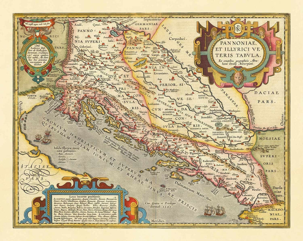 Un mapa de Abraham Ortelius, deliciosamente característico y extremadamente raro, de Europa sudoriental, específicamente de los países balcánicos de Croacia, Serbia y Bosnia y Herzegovina. Fue publicado originalmente en 1573 como parte del Theatrum Orbis Terrarum, el primer atlas moderno del mundo.