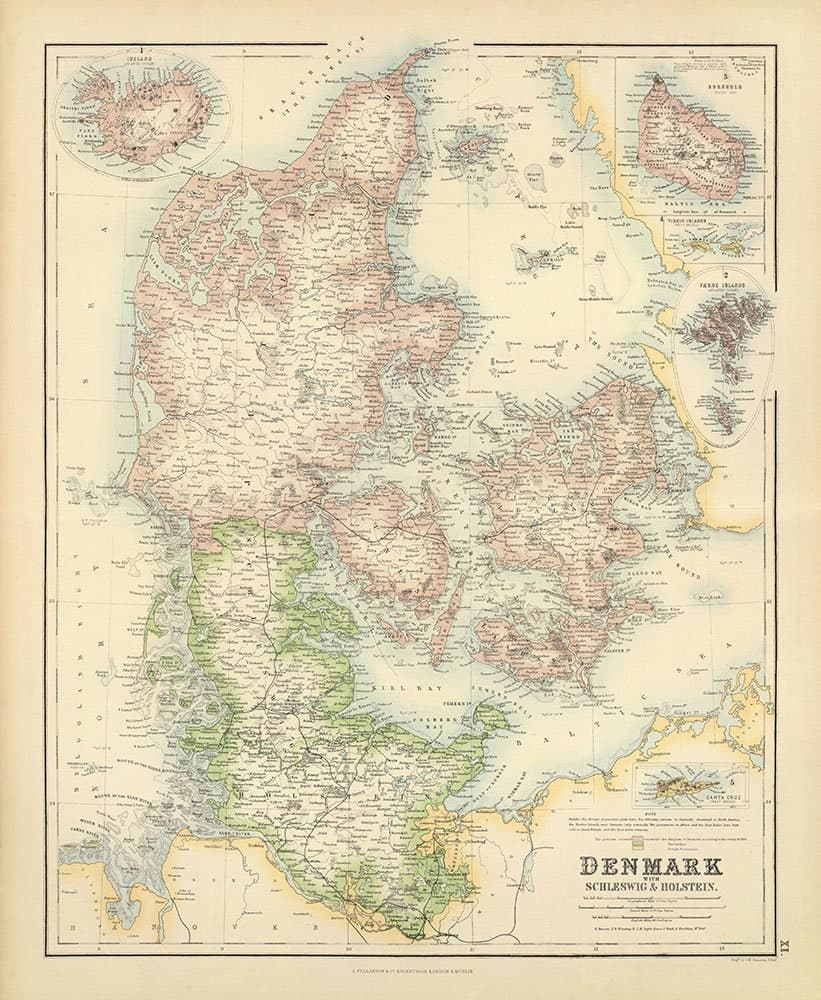 Islandia (entonces parte del reino) también se muestra en este mapa, junto con Bornholm (una isla en el Báltico) y las Islas Feroe (un grupo de islas en el mar del norte, que aún forma parte del reino). Santa Cruz, parte de las Indias Occidentales Danesas, también se muestra en un recuadro.