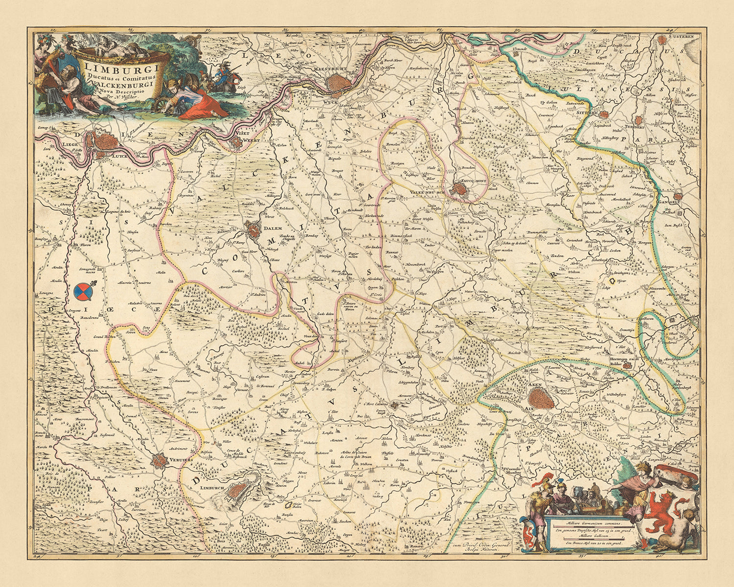 Descubra la rica historia y la intrincada geografía del Ducado de Limburgo y el Condado de Valkenburg con este impresionante mapa elaborado por Nicolaes Visscher II en 1690. El nombre completo del mapa, 'Limburgi Ducatus et Comitatus Valckenburgi nova descriptio', se traduce como 'Nueva descripción' del Ducado de Limburgo y del Condado de Valkenburg", indicando las áreas de interés de esta pieza histórica.