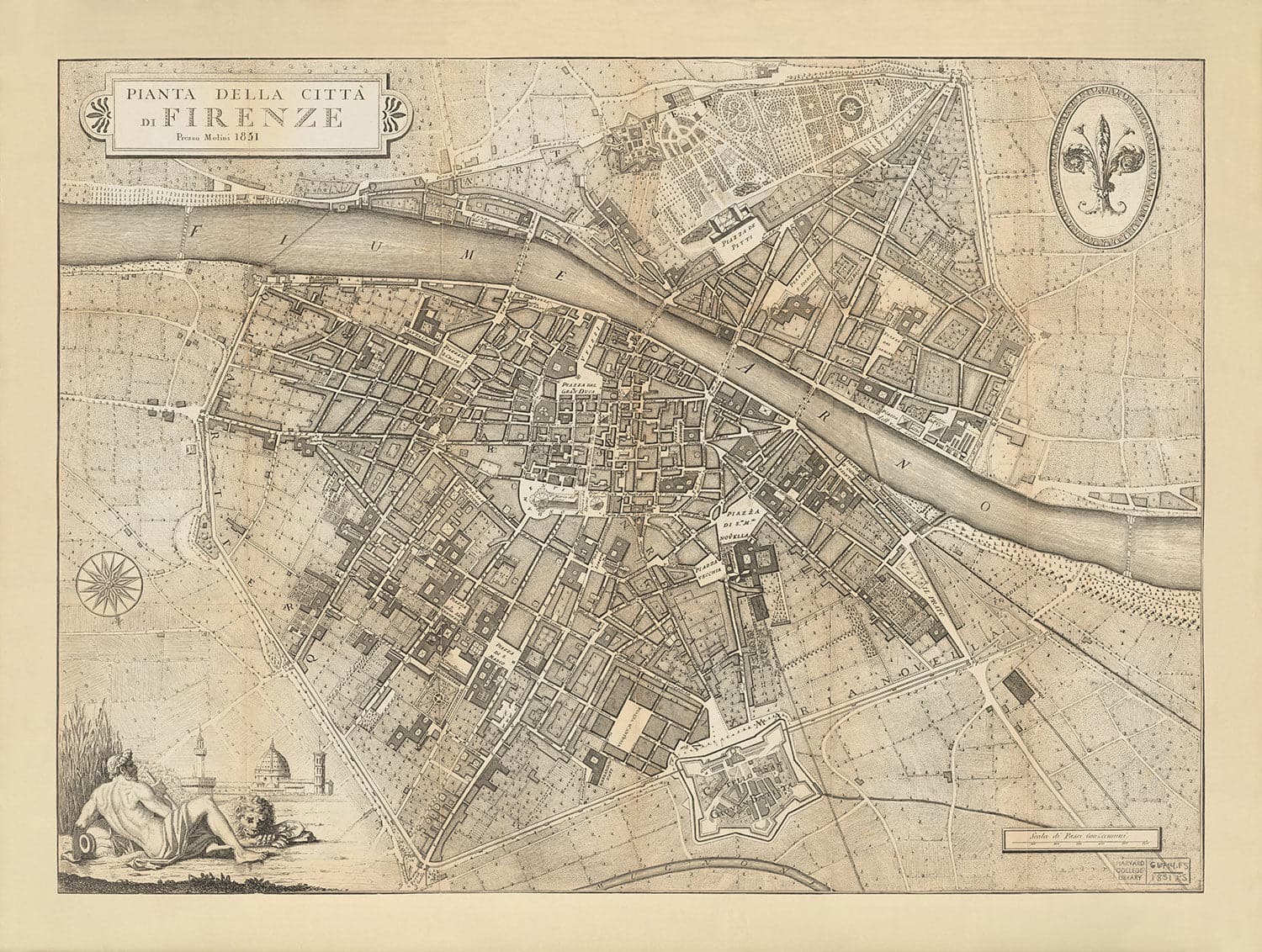 Mapa antiguo de Florencia, Firenze, 1847 por Molini & Ruggieri: Uffizi, Santa Croce, Santo Spirito, Duomo, Piazzas, Palazzos, Ponte Vecchio