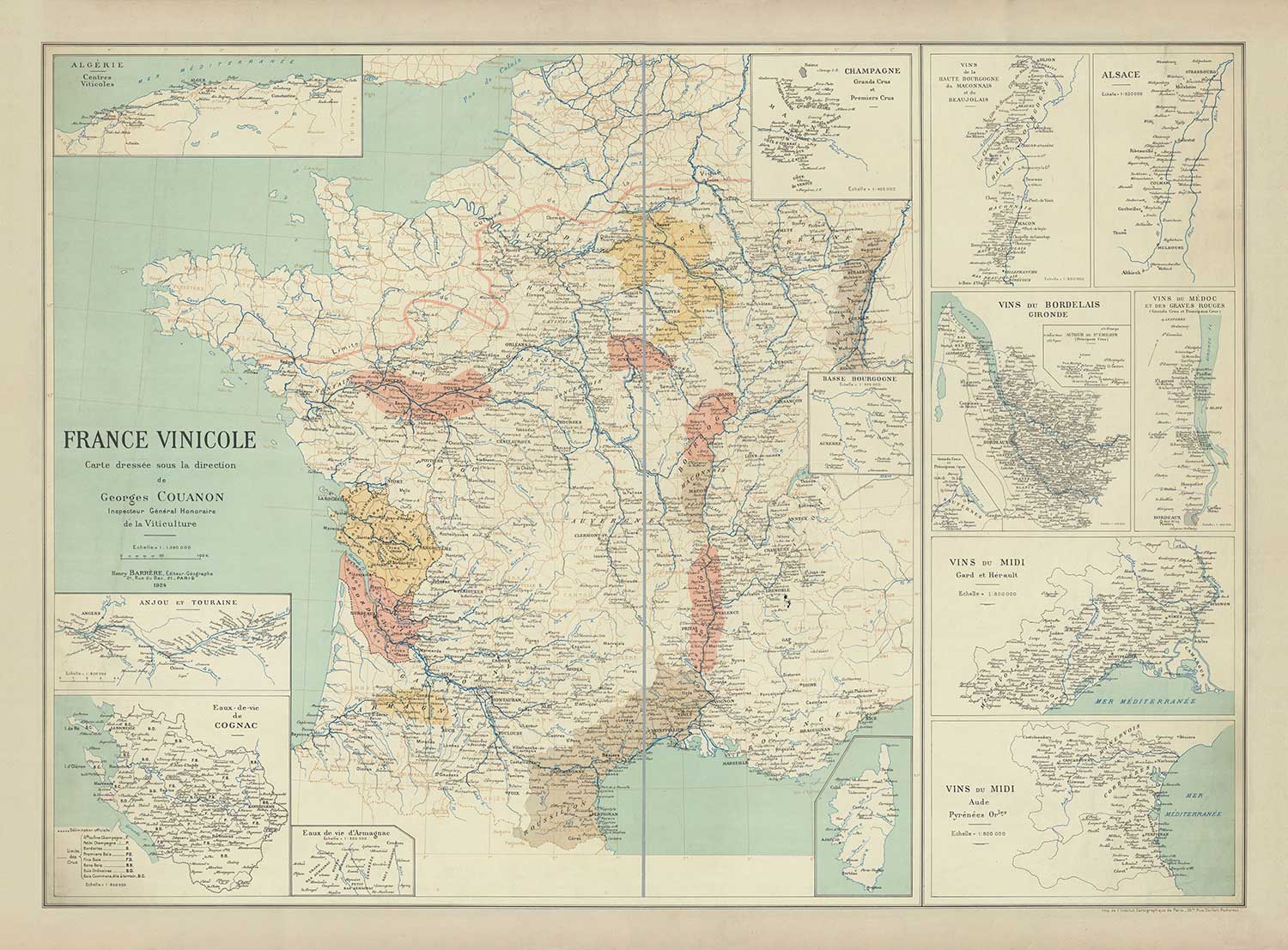Mapa antiguo de las regiones vitícolas francesas, 1924: Burdeos, Ródano, Champaña, Borgoña, Alsacia, Cognac