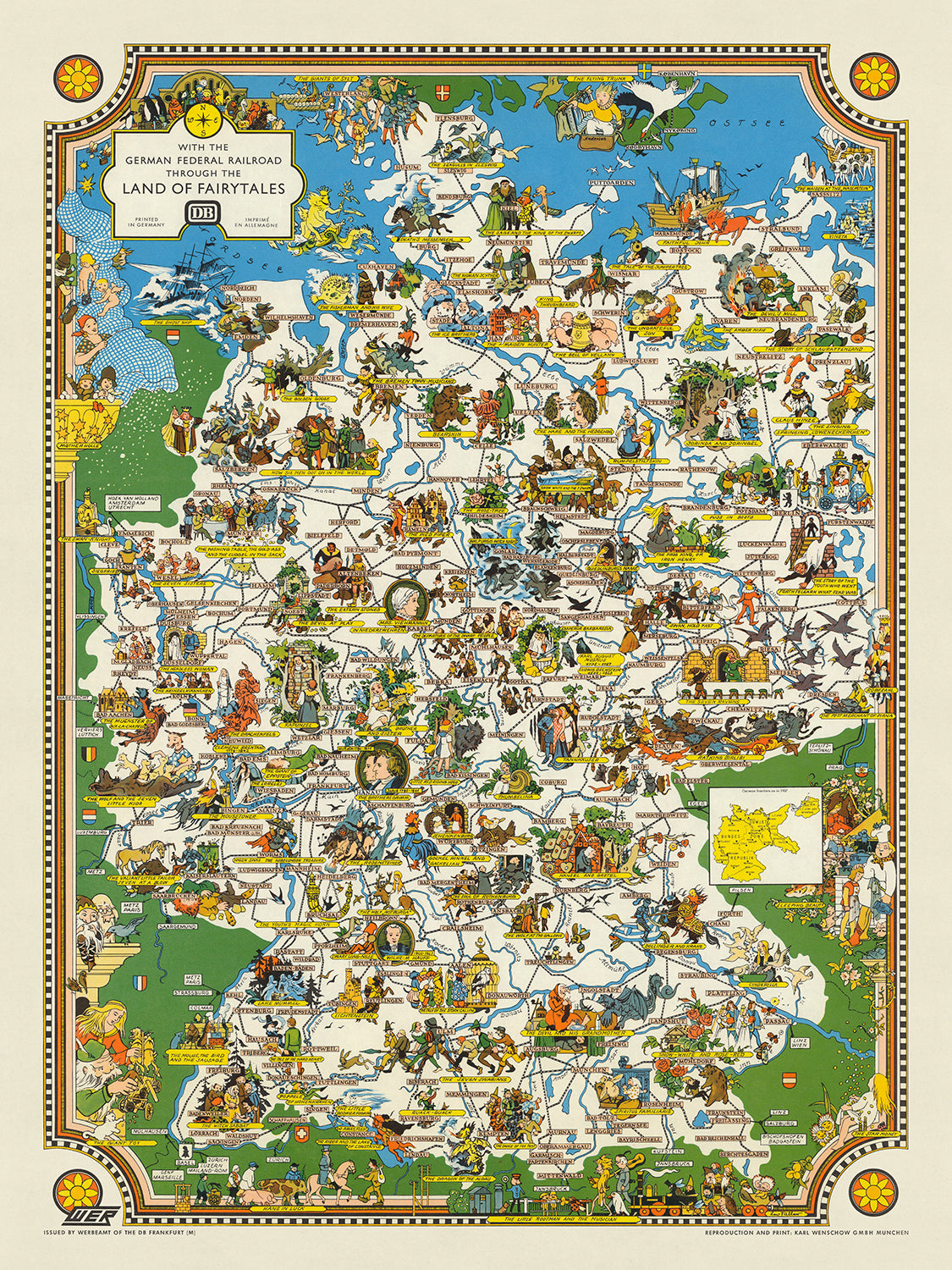 El mapa no solo es un deleite visual, sino también una representación geográfica detallada de Alemania. Las ciudades y pueblos están etiquetados con precisión, mientras que las autopistas y ríos serpentean a través del país, proporcionando una vista completa del paisaje. Las municipalidades están marcadas con letras en bloque en cajas rosas, y los cuentos de hadas están destacados con pancartas amarillas, facilitando la navegación a través de esta tierra fantástica. La inclusión de un mapa adicional titulado "Fronteras alemanas a partir de 1937" añade una capa de contexto histórico, reflejando el paisaje político de la época.