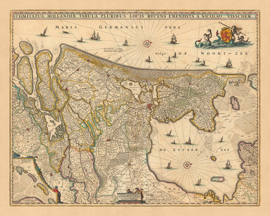 Sumérgete en la rica historia de la Edad de Oro holandesa con este exquisito mapa, 'Comitatus Hollandiae tabula', elaborado por el renombrado cartógrafo Nicolaes Visscher II en 1690. Traducido al inglés, el título del mapa significa 'Mapa del condado de Holanda'. ofreciendo una vista detallada de las diversas regiones y divisiones políticas de Holanda, un área importante dentro de los Países Bajos actuales.