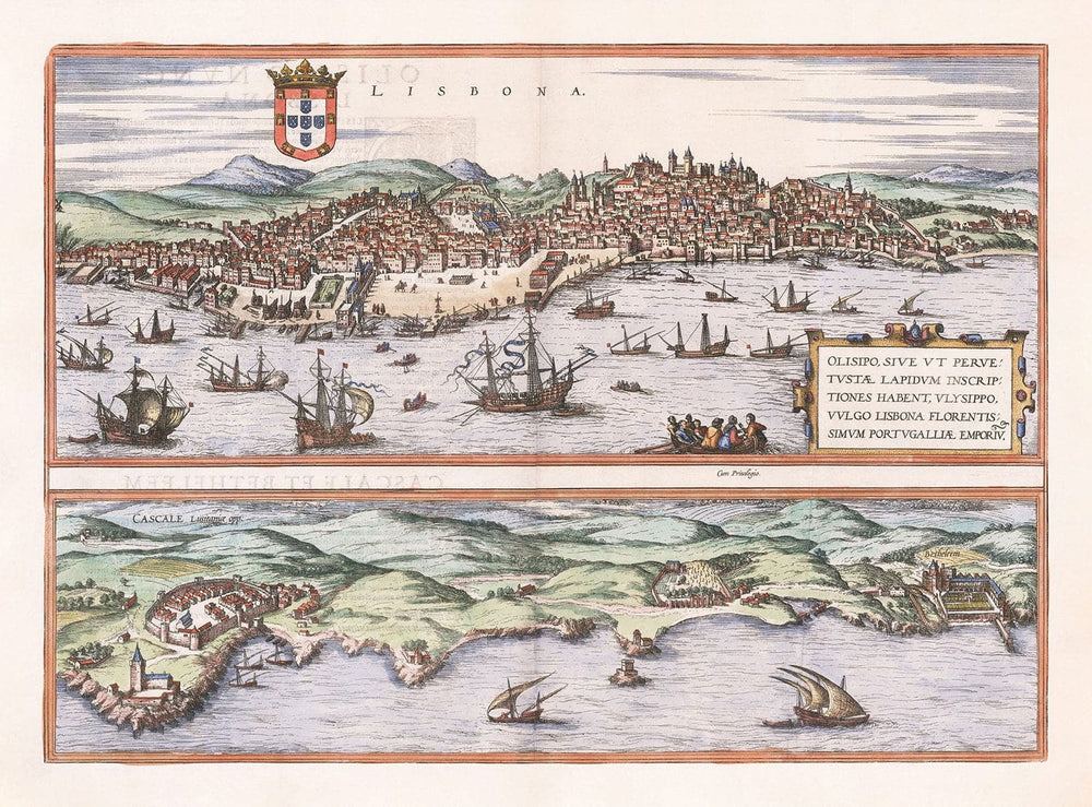 Publicado en 1572 por Georg Braun y Frans Hogenberg, este es probablemente el primer (y más raro) mapa impreso de Lisboa en Portugal. Si Shakespeare hubiera visitado Lisboa, así es como se habría visto. Este mapa fue publicado por primera vez en Civitates Orbis Terrarum - las Ciudades del Mundo - que era una obra maestra cartográfica que presentaba 546 mapas.