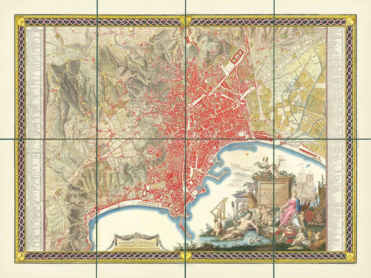 Los grabados detallados del mapa resaltan la geografía única de la ciudad, enclavada entre el resplandeciente Golfo de Nápoles y las escarpadas colinas que enmarcan su paisaje. Las carreteras notables, como la elegante Chiaia y la animada Toledo, están meticulosamente trazadas, lo que ofrece información sobre la planificación urbana y el movimiento dentro de la ciudad. Estas vías, junto a las serenas aguas de la bahía, pintan una imagen vívida de Nápoles como un próspero centro de cultura y comercio.