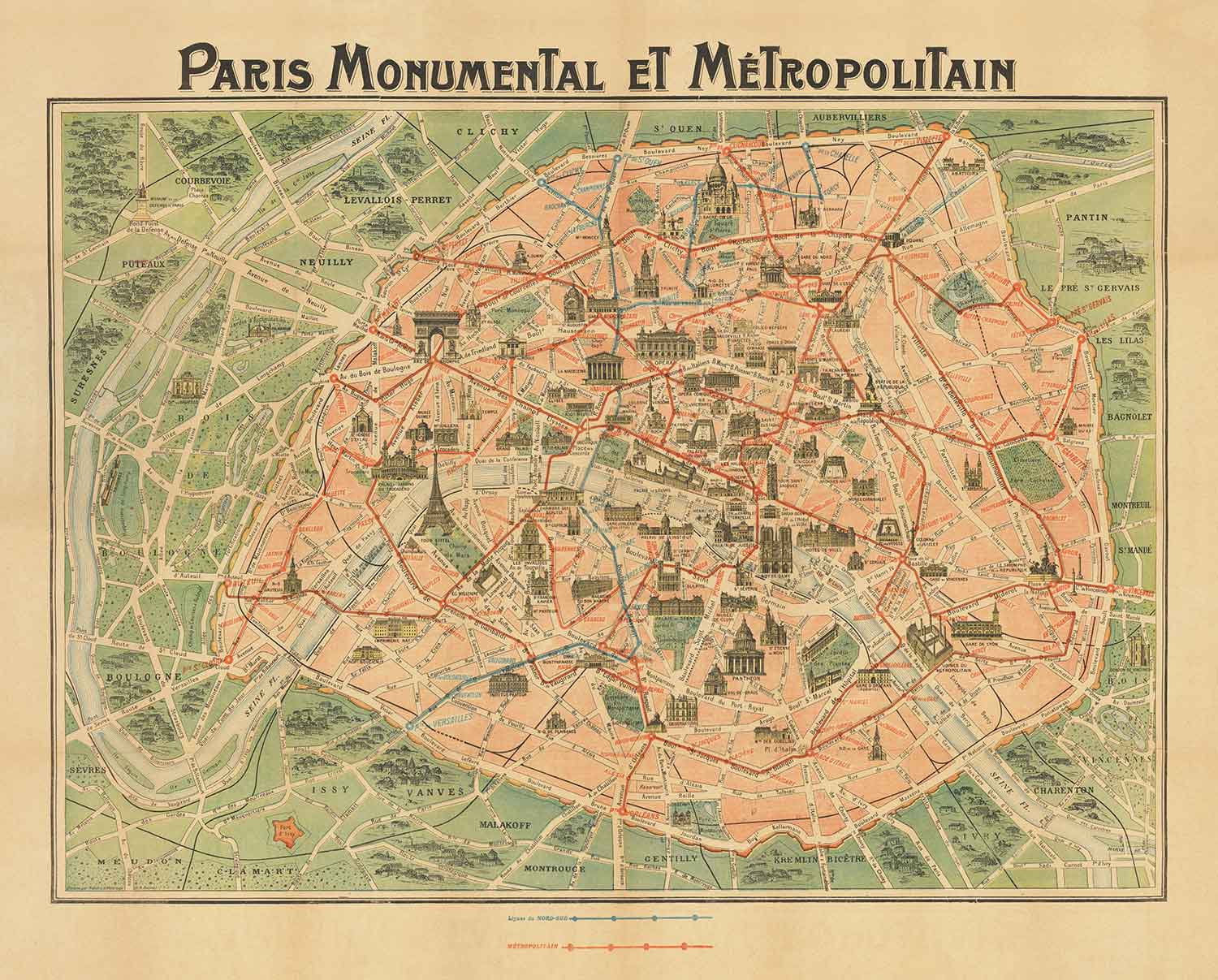 Este mapa se centra tanto en los lugares emblemáticos como en la red de ferrocarril del Metro. En 1920, la red de ferrocarril subterráneo de París tenía dos partes constitutivas: las líneas Nord-Sud en azul y el Metropolitano en rojo. El Nord-Sud fue finalmente incorporado al metro y hoy son las líneas 12 y 13.