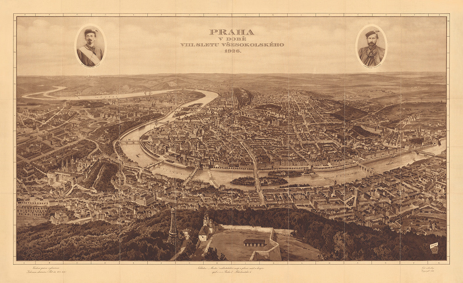 El mapa fue creado para el Rally Internacional All Sokol celebrado en Praga en 1926, un evento de importancia histórica. El movimiento Sokol, un movimiento nacionalista eslavo que promovía el patriotismo y la educación física, fue particularmente popular en la República Checa, y este mapa sirve como un testimonio de ese período. La vista aérea incluye un índice de puntos de interés, anuncios y un "Plʹan sletiště" en el reverso, proporcionando una guía completa de la ciudad durante esta era.