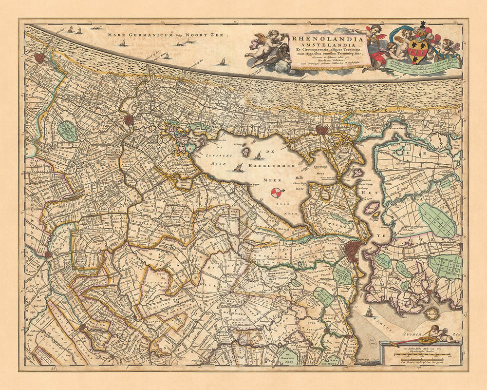 Mapa antiguo de Rijnland y Amstelland por Visscher, 1690: Amsterdam, Haarlem, La Haya, Leiden, Gouda