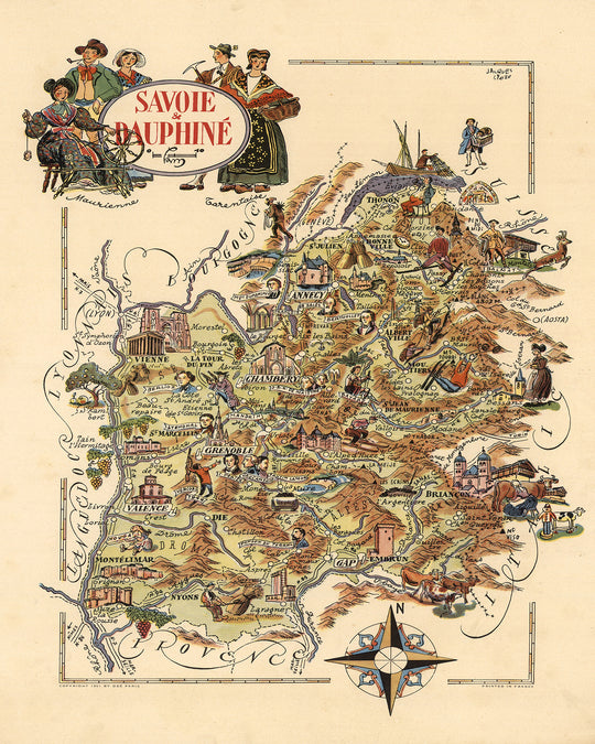 Mapa antiguo de Saboya y Dauphine, Francia, de Jacques Liozu, 1951: Alpes, Grenoble, Chambéry, Annecy