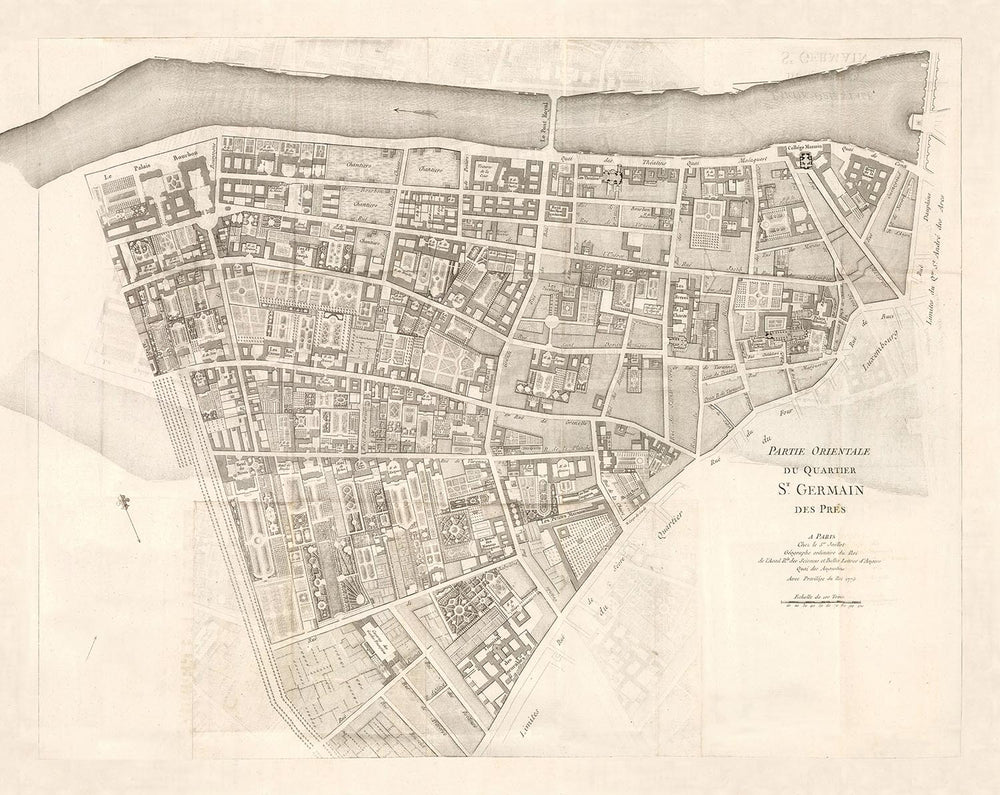 La riqueza histórica del mapa se extiende más allá de su descripción de puntos de referencia físicos. En particular, incluye el Colegio Mazarino, una de las instituciones educativas más prestigiosas de la época, lo que hace alusión al fervor intelectual que caracterizó el período de la Ilustración. Además, se destaca la Caserne des Gardes, un importante emplazamiento militar que albergó a la guardia real francesa. Este mapa no es sólo una representación geográfica, sino una ventana a la vida social, política e intelectual del París del siglo XVIII. Su contenido ofrece una oportunidad única de profundizar en el pasado de la ciudad, lo que la convierte en una pieza verdaderamente intrigante para los entusiastas de la historia, los coleccionistas de mapas y los amantes de París por igual.