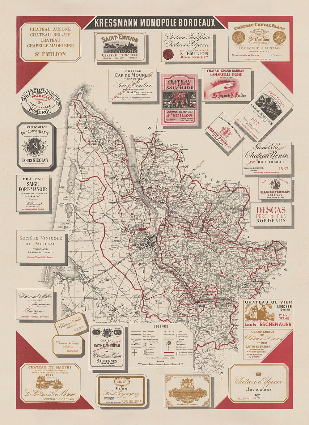 Lo que hace que este mapa sea particularmente interesante es su contexto. Publicado en 1948, refleja una época en la que Burdeos se estaba recuperando de la devastación de la Segunda Guerra Mundial y comenzaba a restablecer su reputación como líder mundial en la producción de vino. De este modo, el mapa sirve no sólo como guía geográfica sino también como documento histórico, que arroja luz sobre un momento crucial en la historia de la región. Desde el sommelier experimentado hasta el entusiasta ocasional del vino, este mapa ofrece una oportunidad única de profundizar en el rico tapiz del patrimonio vitivinícola de Burdeos.