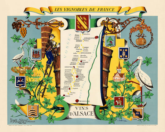 El diseño del mapa es a la vez intrincado y vibrante, con racimos de uvas en rojo y amarillo para indicar las regiones que producen vinos tintos y blancos, respectivamente. Alrededor del mapa hay elementos decorativos como una rosa de los vientos, un velero y un castillo, que se suman a su atractivo estético. Ilustraciones de cigüeñas, arquitectura tradicional alsaciana y motivos relacionados con el vino como barriles y copas de vino enriquecen aún más la narrativa visual. La inclusión de escudos de armas y hojas de parra entrelazadas con el diseño del mapa subraya la profunda conexión entre la identidad de la región y su tradición vitivinícola.