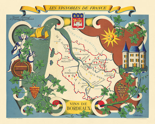 Les Vignobles De France - Vins De Bordeaux, realizado por el ilustre artista francés Rémy Hetreau en 1954, es una obra maestra que captura la esencia de las regiones productoras de vino de Burdeos. Este exquisito mapa, uno de una serie de 11, fue encargado por el Comité National de Propagande en Faveur du Vin, una agencia del gobierno francés dedicada a promover la industria vitivinícola del país. El trabajo de Hetreau no solo resalta las complejidades geográficas de Burdeos, sino que también sirve como una vibrante herramienta de promoción tanto para el vino como para el turismo. El mapa está adornado con racimos de uvas, utilizando el rojo para los vinos tintos y el amarillo para los vinos blancos, lo que lo convierte en una pieza visualmente impactante e informativa.