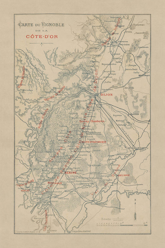 El contexto histórico de la "Carte du Vignoble de la Côte d'Or" es particularmente significativo. Creado durante un período de gran avance en la cartografía, el mapa refleja el creciente interés en la cartografía agrícola y económica. La Côte d'Or, con sus célebres viñedos y tradiciones vinícolas centenarias, fue un tema natural para tal trabajo cartográfico detallado. Este mapa proporciona una visión del diseño y la extensión de los viñedos en un momento en que la industria del vino de Borgoña estaba consolidando su reputación global.